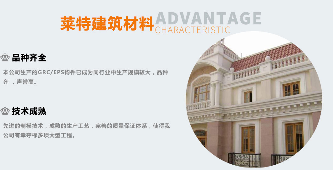 鷹潭市萊特建筑裝飾有限公司是一家集研發(fā)、生產(chǎn)、銷售、安裝、服務為一體的EPS浮雕,EPS線條,GRC構(gòu)件,GRG構(gòu)件,浮雕,外墻涂料, 牛角雕工藝品,裝飾材料生產(chǎn)銷售企業(yè)。擁有專業(yè)從事EPS/GRC線條二十多年研發(fā),生產(chǎn),安裝,銷售經(jīng)驗。